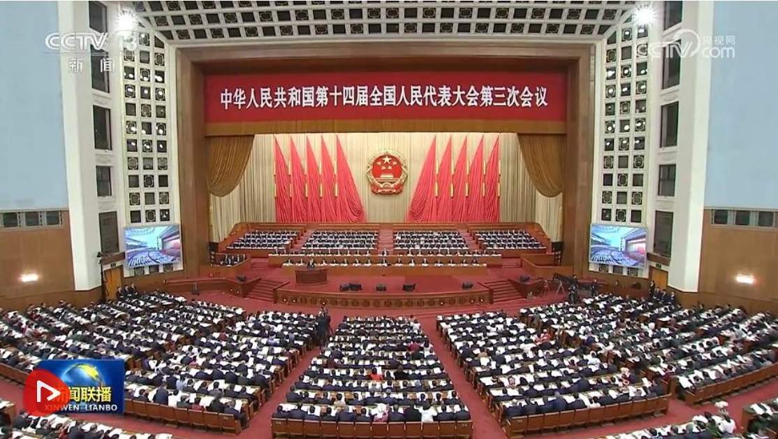 上午9時(shí),趙樂際宣布:中華人民共和國第十四屆全國人民代表大會(huì)第三次會(huì)議開幕。會(huì)場全體起立,高唱國歌。