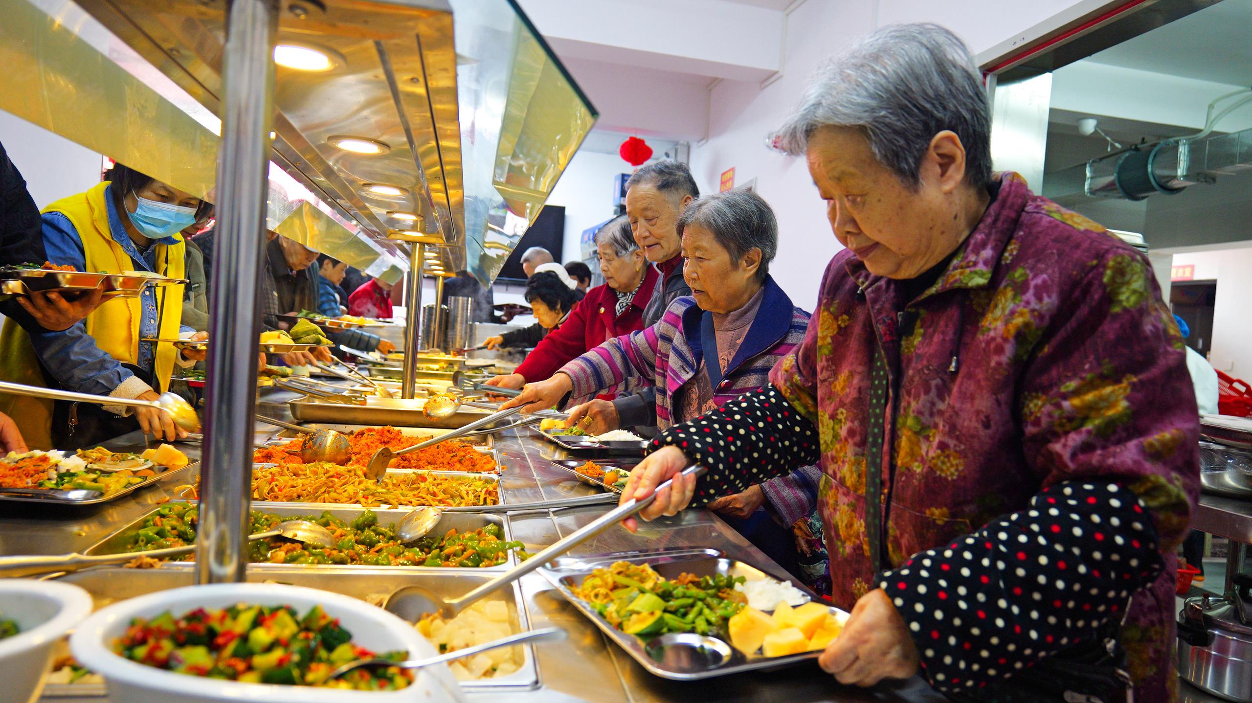湖北恩施一社區(qū)“幸福食堂”里,社區(qū)老人、退休職工在排隊取餐。