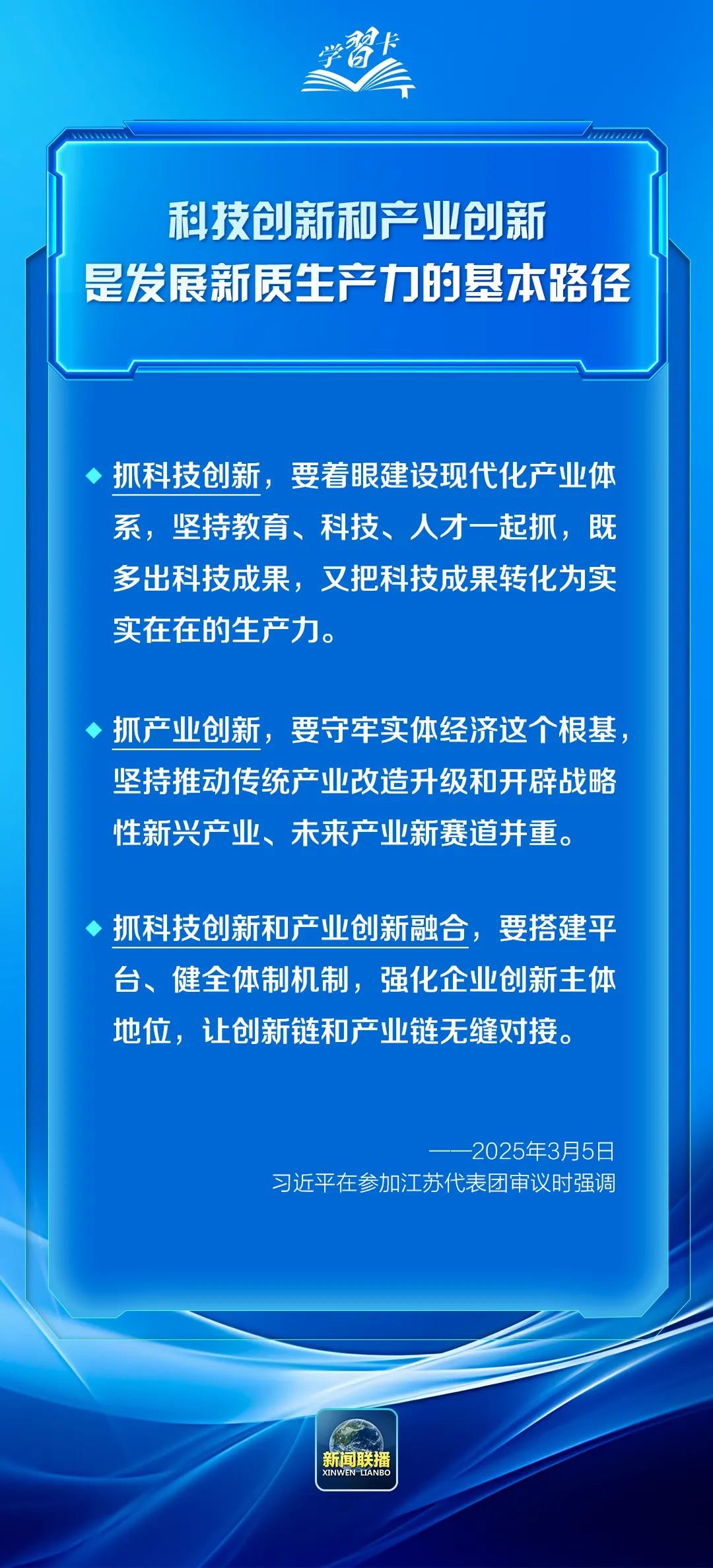 2025年全國兩會期間,習近平總書記參加團組審議討論時,多次提到科技創(chuàng)新這一關鍵命題,強調“科技創(chuàng)新和產業(yè)創(chuàng)新,是發(fā)展新質生產力的基本路徑”。一起學習↓