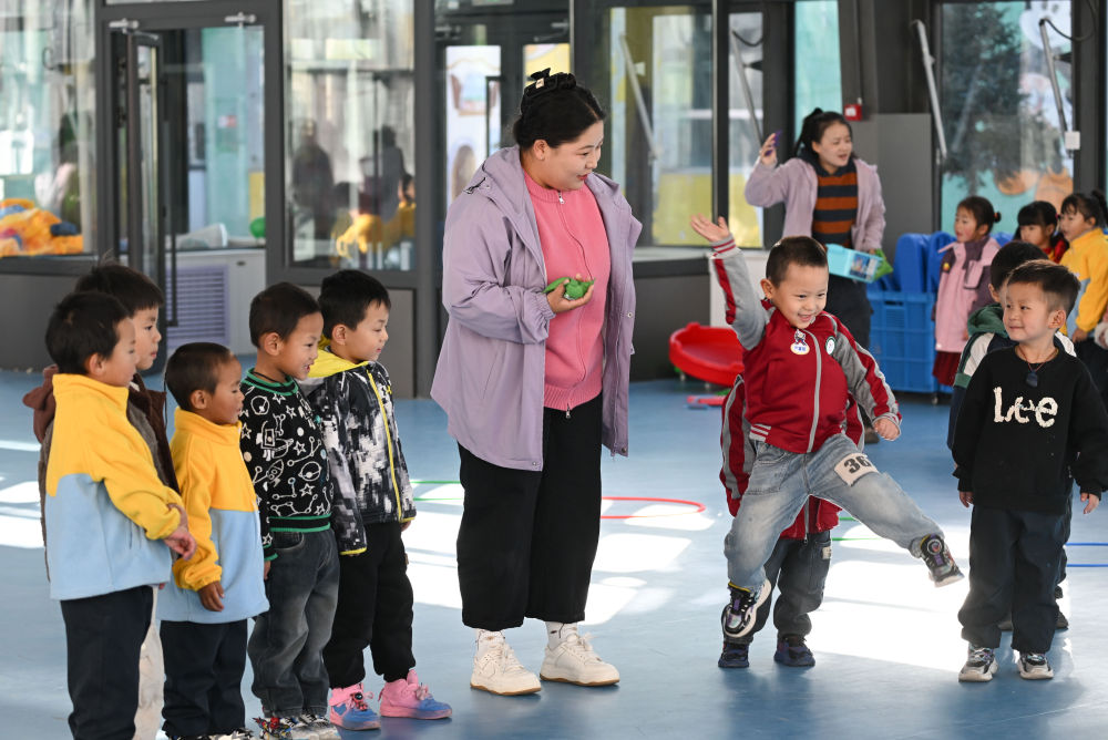 2024年11月14日,在青海省海西蒙古族藏族自治州天峻縣民族幼兒園,小朋友們在老師帶領(lǐng)下上體育課。新華社記者 張龍 攝