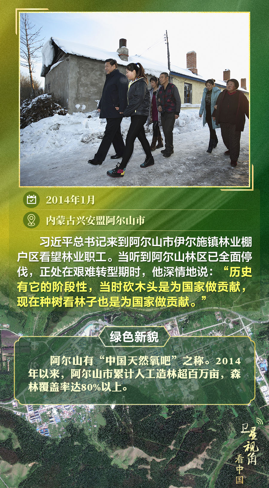 通過衛(wèi)星視角,一起俯瞰總書記去過的這些林區(qū),重溫總書記對造林護(hù)林的殷殷囑托,感受綠色新貌。