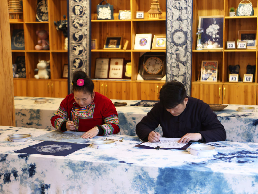 2025年3月14日,村民在肇興侗寨內(nèi)制作蠟染。近年來(lái),當(dāng)?shù)丶哟髮?duì)少數(shù)民族非遺文創(chuàng)產(chǎn)品的研發(fā)和創(chuàng)新力度,同時(shí)進(jìn)一步加強(qiáng)線上銷售,通過(guò)微信、網(wǎng)上直播、網(wǎng)店等方式進(jìn)行帶貨,讓當(dāng)?shù)厝罕娡ㄟ^(guò)指尖增收致富。