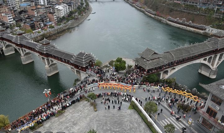 2024年2月22日,在貴州省黔東南苗族侗族自治州錦屏縣,舞龍隊(duì)經(jīng)過(guò)兩座風(fēng)雨橋的交匯處。風(fēng)雨橋,又稱“花橋”,是侗族的標(biāo)志性建筑之一。因橋上建有廊和亭,既可行人又可遮蔽風(fēng)雨,故稱風(fēng)雨橋。其以木為料、以榫銜接,是侗族橋梁建筑藝術(shù)的結(jié)晶。鼓樓、花橋的侗族木構(gòu)建筑營(yíng)造技藝被列入國(guó)家級(jí)非物質(zhì)文化遺產(chǎn)代表性項(xiàng)目。