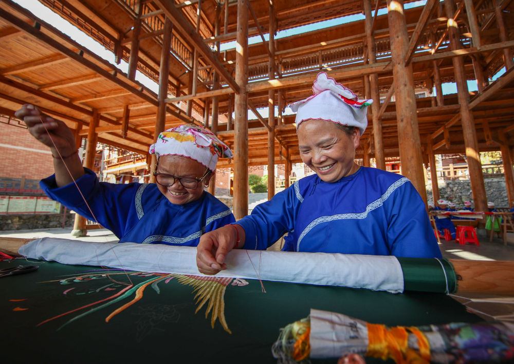 2021年9月27日,貴州省鎮(zhèn)遠(yuǎn)縣報(bào)京鄉(xiāng)報(bào)京村村民邰木香(右)在制作侗繡。邰木香將侗族的民間故事以刺繡形式展現(xiàn)出來(lái),還先后開(kāi)發(fā)出傳統(tǒng)與現(xiàn)代相結(jié)合的侗族服飾、工藝包、繡花鞋、圍腰、頭巾、枕巾等系列產(chǎn)品,深受國(guó)內(nèi)外客商的青睞,致富的同時(shí)帶動(dòng)當(dāng)?shù)?00多名繡娘實(shí)現(xiàn)就業(yè)增收。