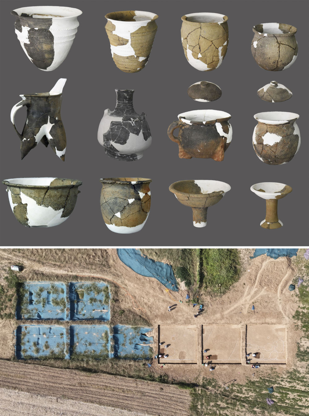 拼版照片:上圖為位于河南南陽方城縣的八里橋遺址出土的陶器(河南省文物考古研究院供圖);下圖為八里橋遺址發(fā)掘現(xiàn)場(無人機照片,新華社記者袁月明2024年9月11日攝)。八里橋遺址是豫南地區(qū)已發(fā)現(xiàn)規(guī)模最大、等級最高的二里頭文化聚落,為探索夏文化地方城邑聚落形態(tài)、社會結構提供了新線索。