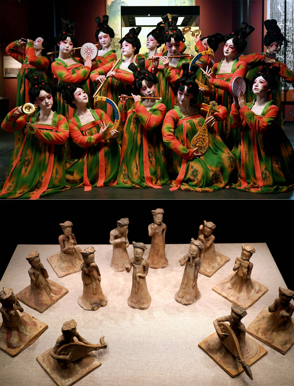 拼版照片:上圖為鄭州歌舞劇院的演員在錄制河南博物院元宵奇妙夜節(jié)目(2021年2月20日攝);下圖為河南博物院主展館內展出的展品(2020年9月24日攝)。