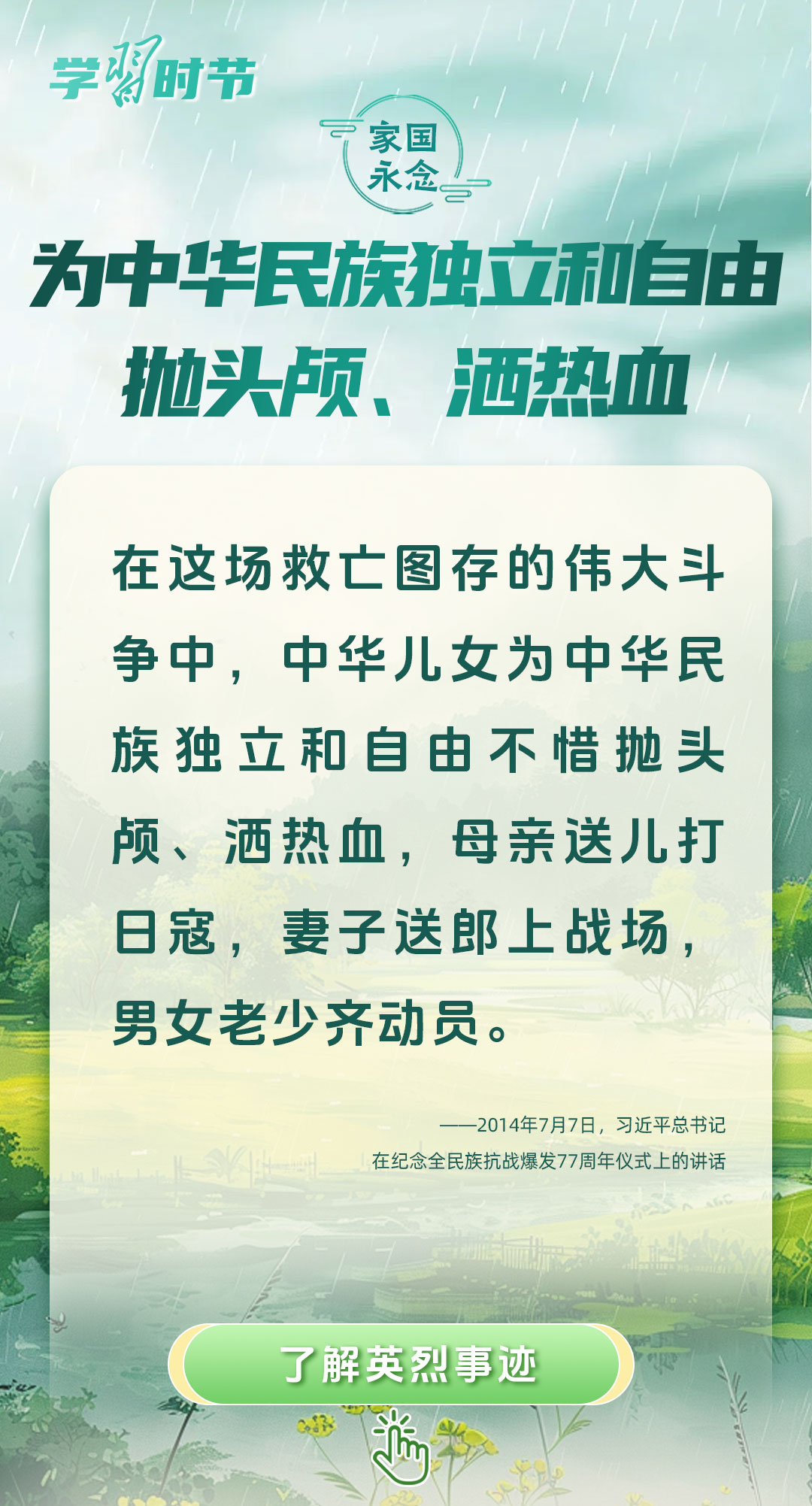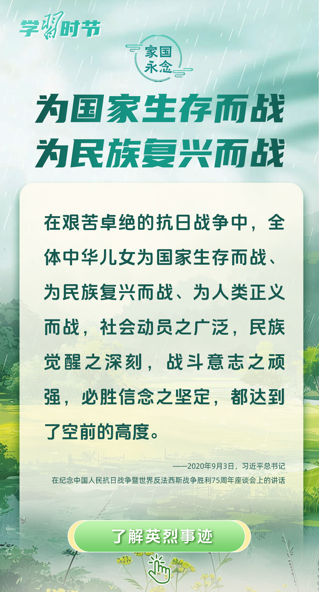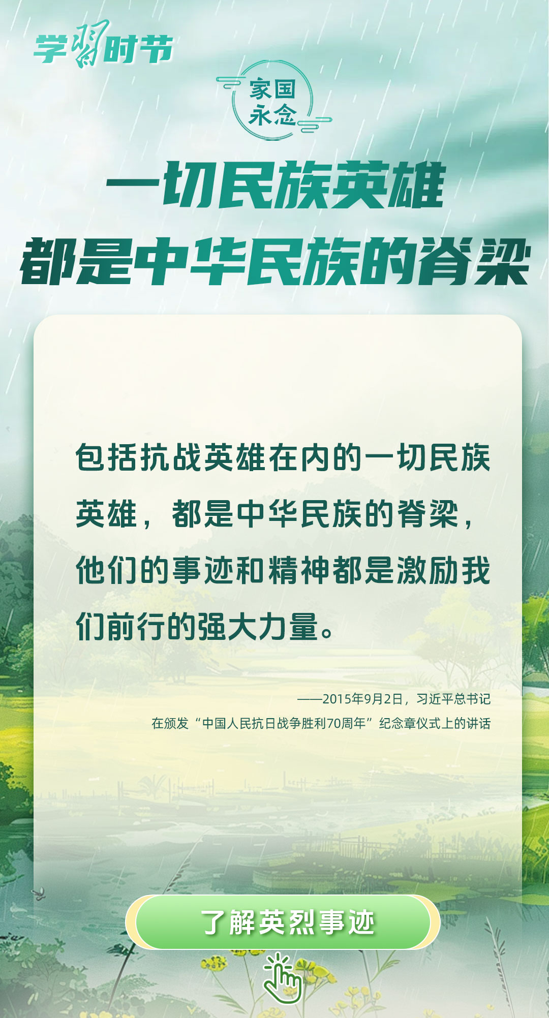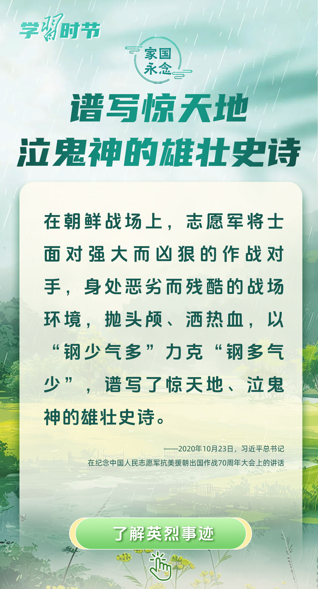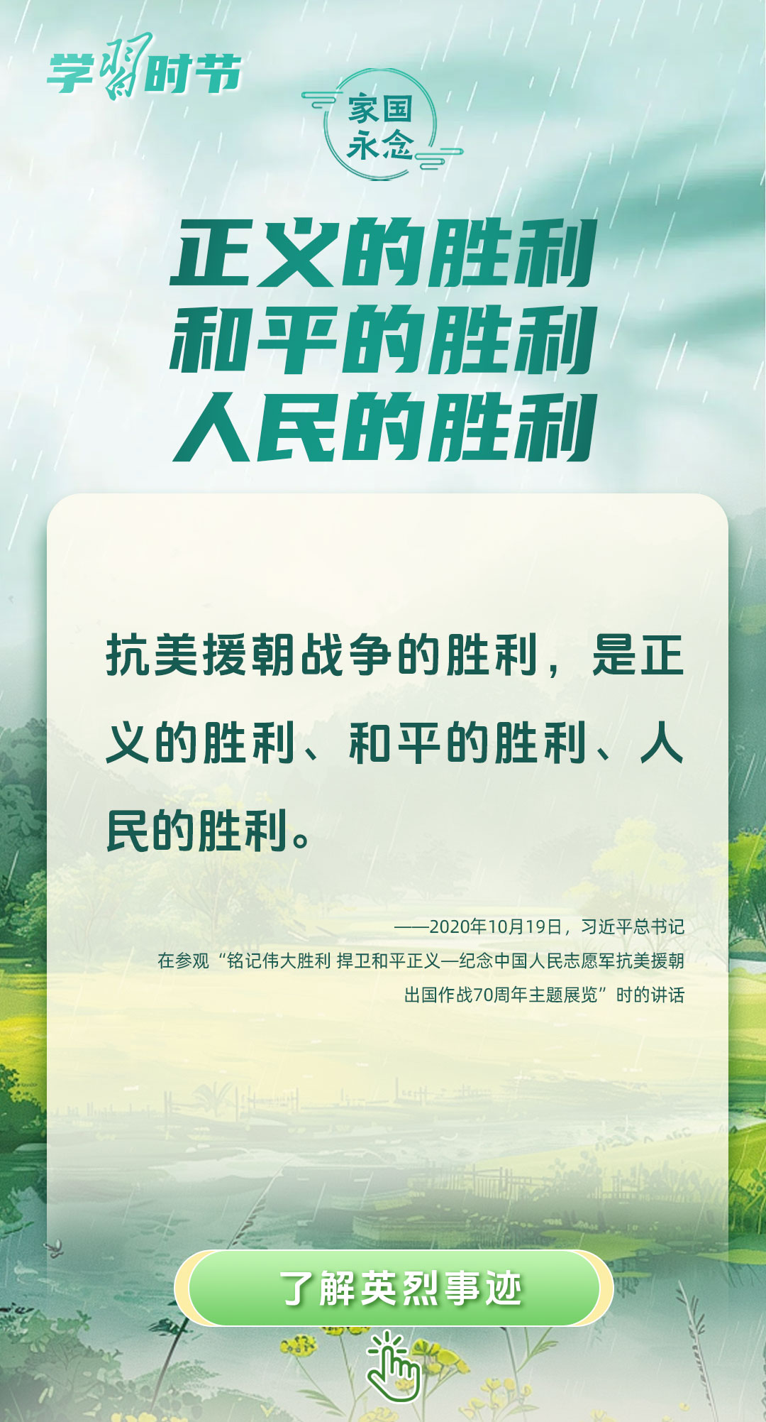 今年是中國人民抗日戰(zhàn)爭暨世界反法西斯戰(zhàn)爭勝利80周年、中國人民志愿軍抗美援朝出國作戰(zhàn)75周年。習(xí)近平總書記曾說:“對一切為國家、為民族、為和平付出寶貴生命的人們,不管時代怎樣變化,我們都要永遠銘記他們的犧牲和奉獻?!苯裉煳覀兯鶕碛械囊磺校瑹o不凝結(jié)著英雄、英烈們的奉獻付出乃至巨大犧牲。