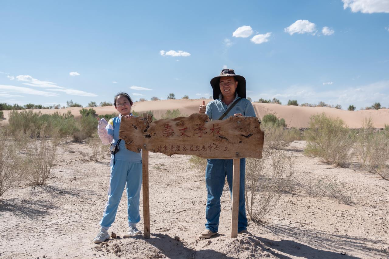 天地茫茫,站在“崇文林”的標(biāo)志旁,背后是巴丹吉林沙漠。前方的高山上,一座紀(jì)念碑高高佇立,上面書寫著習(xí)近平總書記在甘肅視察時強(qiáng)調(diào)的“確保民勤不成為第二個羅布泊”。