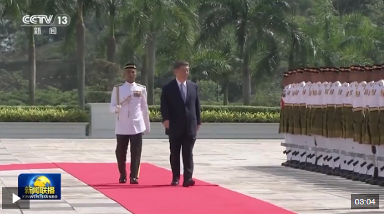 習(xí)近平乘車抵達(dá)時(shí),易卜拉欣和馬來(lái)西亞總理安瓦爾在下車處熱情迎接。兩國(guó)元首登上檢閱臺(tái),軍樂(lè)團(tuán)奏中馬兩國(guó)國(guó)歌,鳴禮炮21響。習(xí)近平檢閱儀仗隊(duì)。兩國(guó)元首進(jìn)入國(guó)家王宮大廳,同雙方陪同人員握手致意。