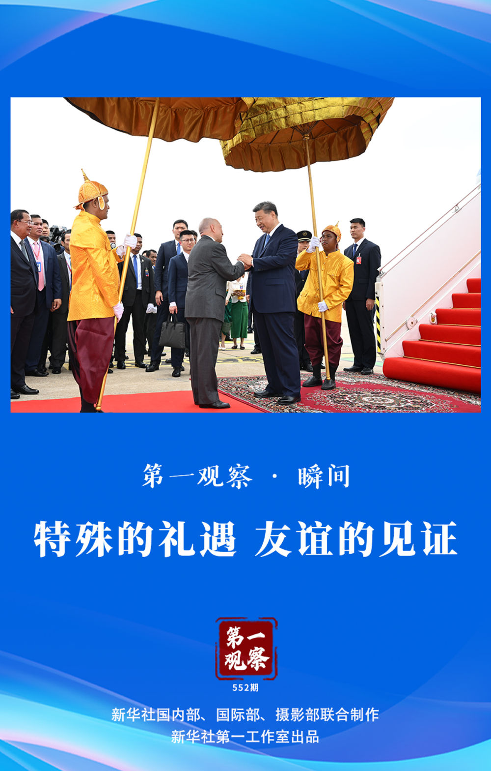 這是西哈莫尼國(guó)王首次在機(jī)場(chǎng)舉行盛大儀式歡迎外國(guó)貴賓。柬埔寨王室珍娜公主向習(xí)近平主席獻(xiàn)上茉莉花手環(huán),數(shù)百名當(dāng)?shù)孛癖姄]舞兩國(guó)國(guó)旗,手持“柬中友誼、團(tuán)結(jié)、合作萬歲!”等紅色橫幅熱情歡迎中國(guó)朋友……
