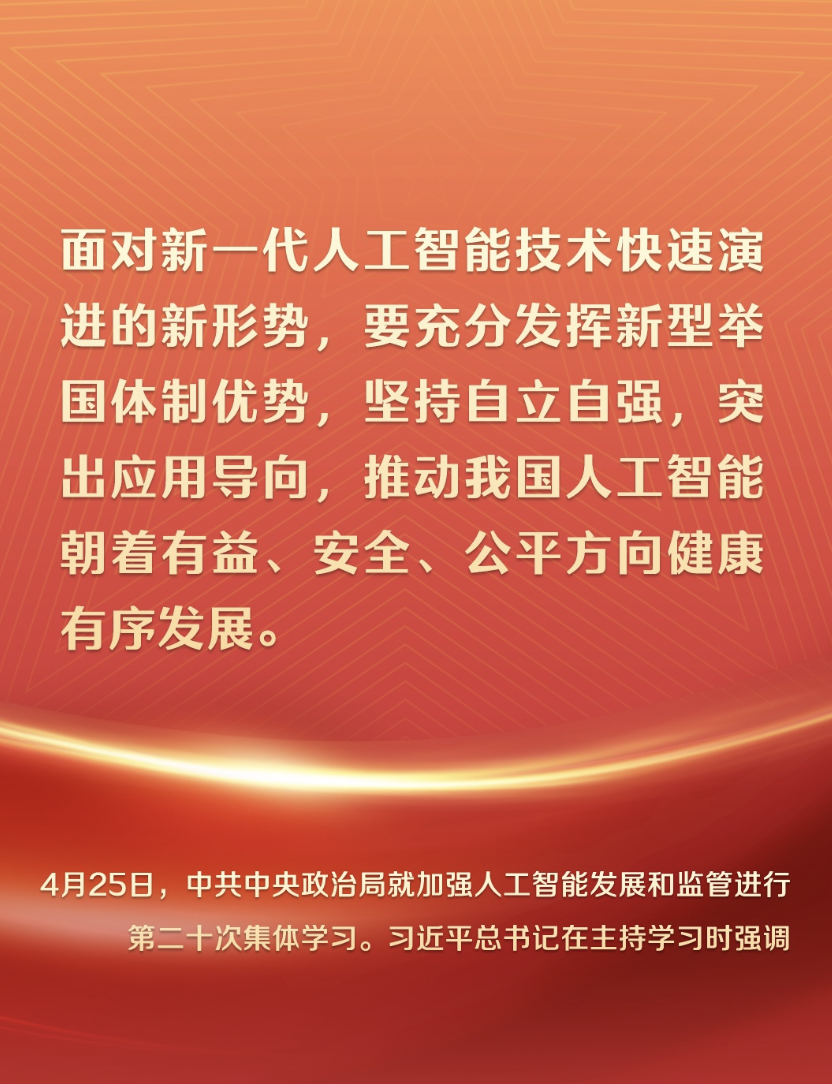 就在4天前,4月25日下午,中共中央政治局就加強人工智能發(fā)展和監(jiān)管進行第二十次集體學習。習近平總書記在主持學習時強調(diào):