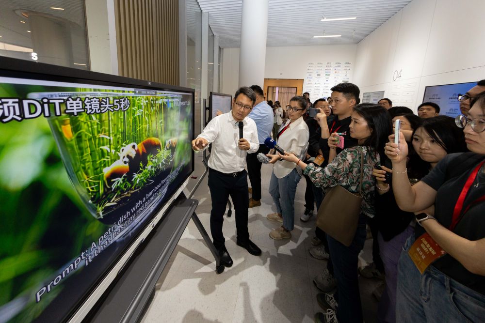 2024年5月23日,在“模速空間”,工作人員為采訪團介紹運用大模型文生視頻。