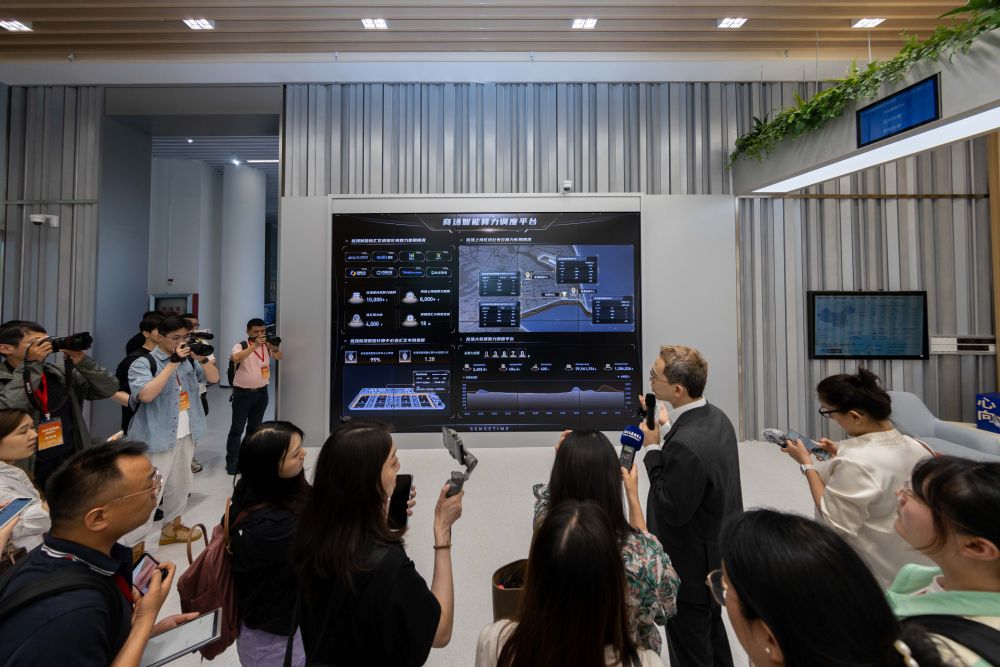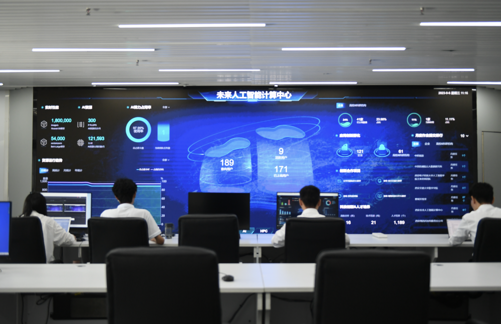 2023年9月6日,在陜西西安的未來人工智能計算中心監(jiān)控運維室,工作人員通過智慧大屏監(jiān)測平臺運行情況。