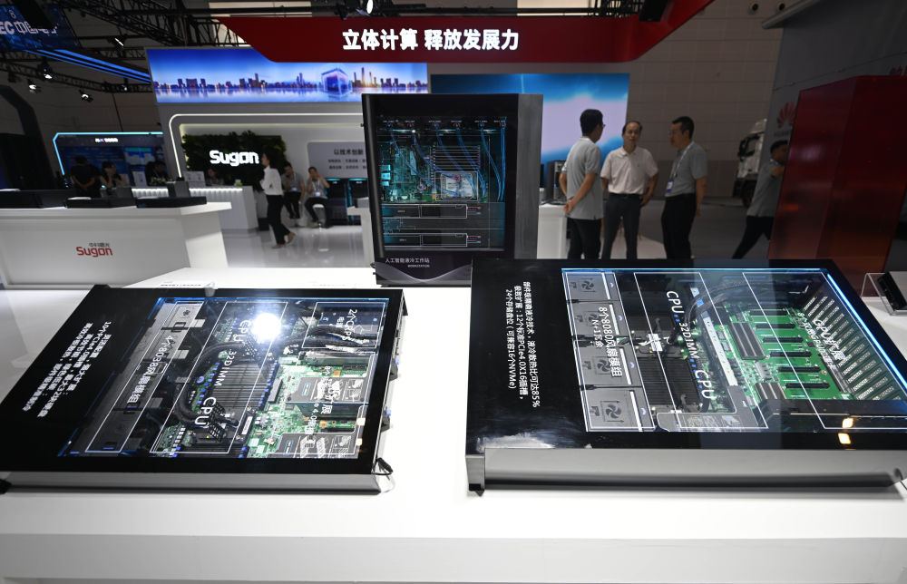 這是2024年6月20日在2024世界智能產(chǎn)業(yè)博覽會上拍攝的中科曙光展區(qū)的一臺人工智能服務(wù)器。