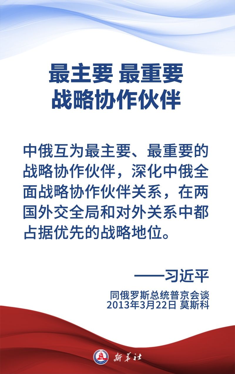 中俄關(guān)系歷經(jīng)風(fēng)雨,歷久彌堅(jiān),樹立了大國(guó)、鄰國(guó)永久睦鄰友好、全面戰(zhàn)略協(xié)作、互利合作共贏的典范。習(xí)近平主席和普京總統(tǒng)保持密切交往,為新時(shí)代中俄關(guān)系作出頂層設(shè)計(jì),提供戰(zhàn)略引領(lǐng)。在國(guó)事訪問(wèn)等重要場(chǎng)合,習(xí)近平主席這樣論述中俄關(guān)系——