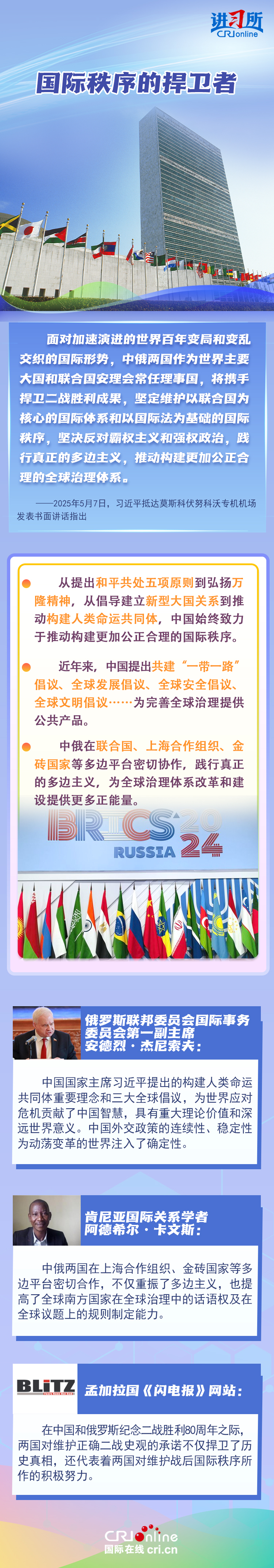 “兩國人民用鮮血和生命凝結(jié)的深厚情誼,如黃河之水奔騰不息,似伏爾加河寬廣深沉,成為中俄世代友好的不竭源泉?!苯衲晔侵袊嗣窨谷諔?zhàn)爭(zhēng)、蘇聯(lián)偉大衛(wèi)國戰(zhàn)爭(zhēng)暨世界反法西斯戰(zhàn)爭(zhēng)勝利80周年,也是聯(lián)合國成立80周年。在這一重要?dú)v史時(shí)間節(jié)點(diǎn),習(xí)近平主席此訪不僅為中俄關(guān)系發(fā)展注入強(qiáng)勁動(dòng)力,也向世界宣示中俄兩國攜手捍衛(wèi)二戰(zhàn)勝利成果的堅(jiān)定意志。