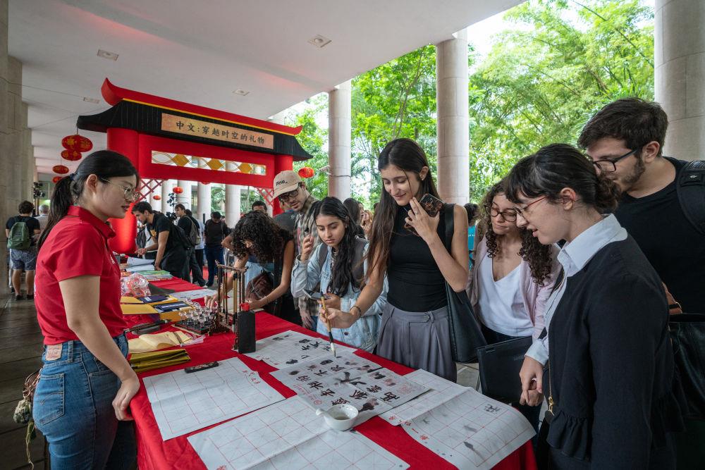 2025年4月,在巴西里約熱內(nèi)盧天主教大學(xué)舉辦的“國(guó)際中文日”慶?;顒?dòng)上,學(xué)生們體驗(yàn)中文書法。