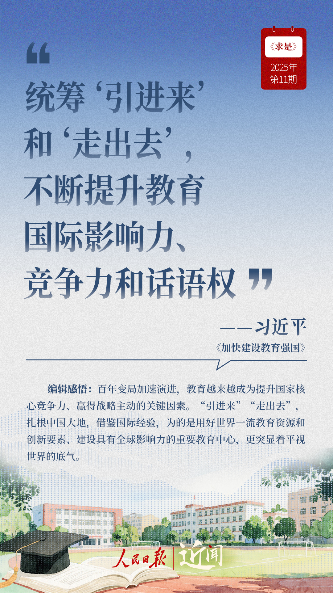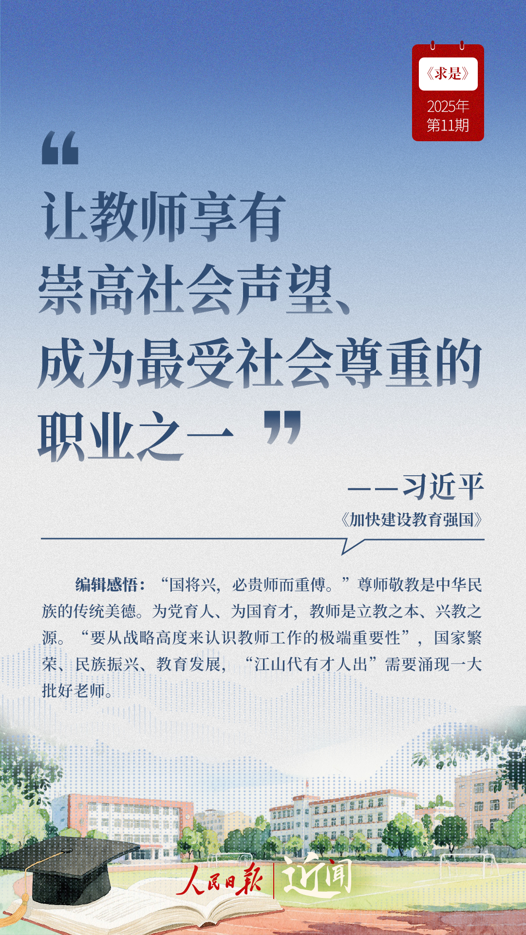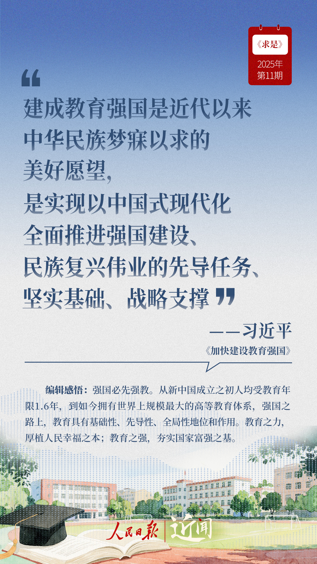 教育是國(guó)之大計(jì)、黨之大計(jì)。日前,《求是》雜志發(fā)表習(xí)近平總書(shū)記重要文章《加快建設(shè)教育強(qiáng)國(guó)》?!叭姘盐战逃恼螌傩?、人民屬性、戰(zhàn)略屬性”“讓教育改革發(fā)展成果更多更公平惠及全體人民”“讓教師享有崇高社會(huì)聲望、成為最受社會(huì)尊重的職業(yè)之一”……通過(guò)這些話,一起感悟習(xí)近平總書(shū)記對(duì)教育強(qiáng)國(guó)建設(shè)的謀劃與部署。