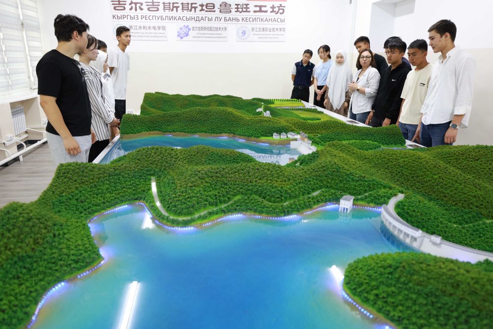 2025年6月4日,學生在吉爾吉斯斯坦首都比什凱克的魯班工坊水利樞紐工程模擬演示實驗室學習水電站知識。這家魯班工坊由浙江水利水電學院與吉爾吉斯斯坦國立技術(shù)大學等聯(lián)合建設,投入運行半年多來,已有4000多名學生在這里接受技術(shù)培訓。