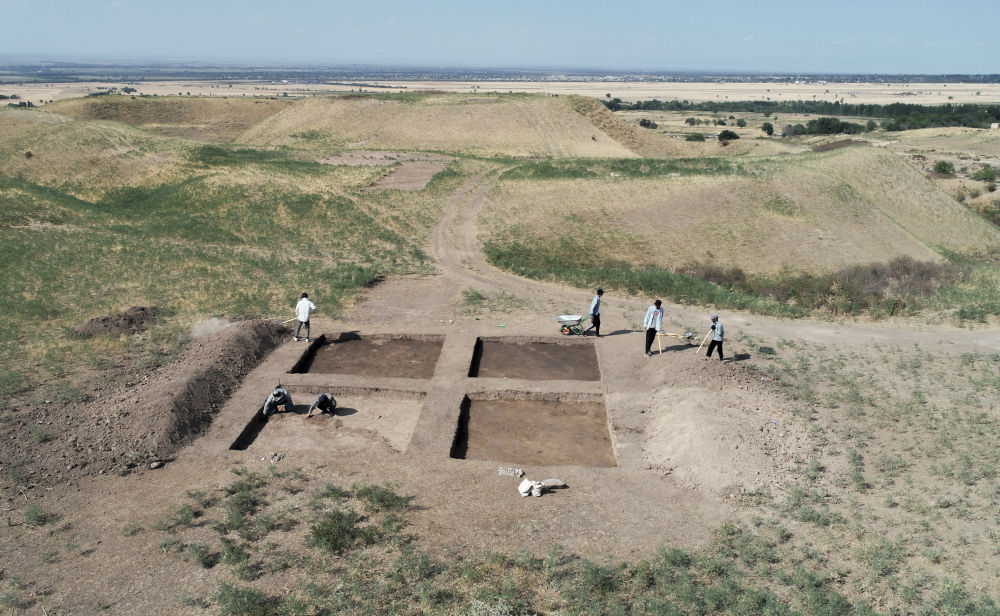 2023年8月9日,考古人員在中哈聯(lián)合考古項目拉哈特遺址探方上工作(無人機照片)。從2017年開始,陜西省考古研究院與哈薩克斯坦伊塞克國家歷史文化博物館組成聯(lián)合考古隊,對拉哈特遺址及附近相關遺址開展考古調(diào)查與發(fā)掘工作。