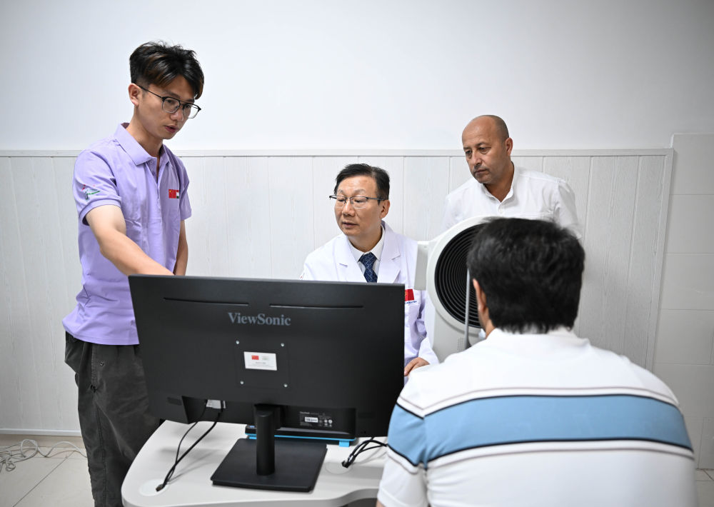 2025年5月31日,在塔吉克斯坦杜尚別,中國眼科專家黨光福(中)在防盲合作中心為當?shù)厥忻褡鲅劭茩z查。當日,“健康快車中塔防盲合作中心”在塔吉克斯坦首都杜尚別開始運營。該中心旨在加強中塔兩國眼科醫(yī)療合作,促進雙方眼科醫(yī)護人員互訪培訓和學術(shù)交流,將惠及更多眼疾患者。