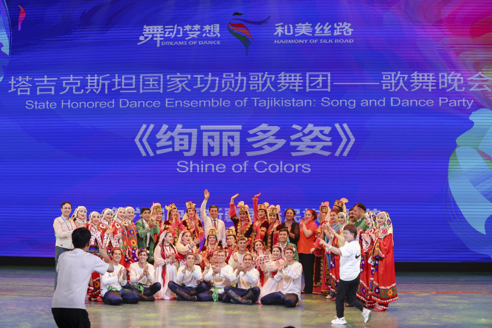 2023年7月27日,由塔吉克斯坦羅拉國家功勛歌舞團帶來的歌舞晚會《絢麗多姿》在新疆烏魯木齊晚報劇院上演。這是演員在演出結(jié)束后合影留念。