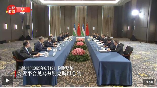 當(dāng)?shù)貢r(shí)間6月17日上午,國(guó)家主席習(xí)近平在阿斯塔納出席第二屆中國(guó)-中亞峰會(huì)期間會(huì)見(jiàn)烏茲別克斯坦總統(tǒng)米爾濟(jì)約耶夫。