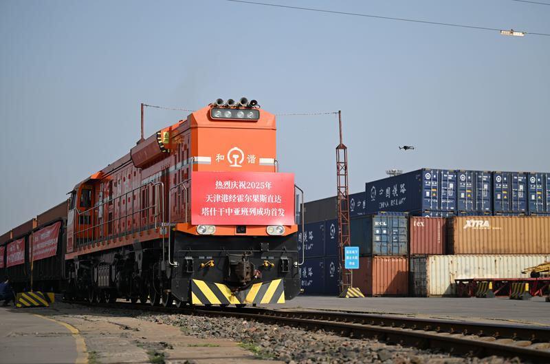 △5月20日,2025年首列天津港經(jīng)霍爾果斯直達(dá)塔什干的中亞班列從天津港物捷三堆場發(fā)車。