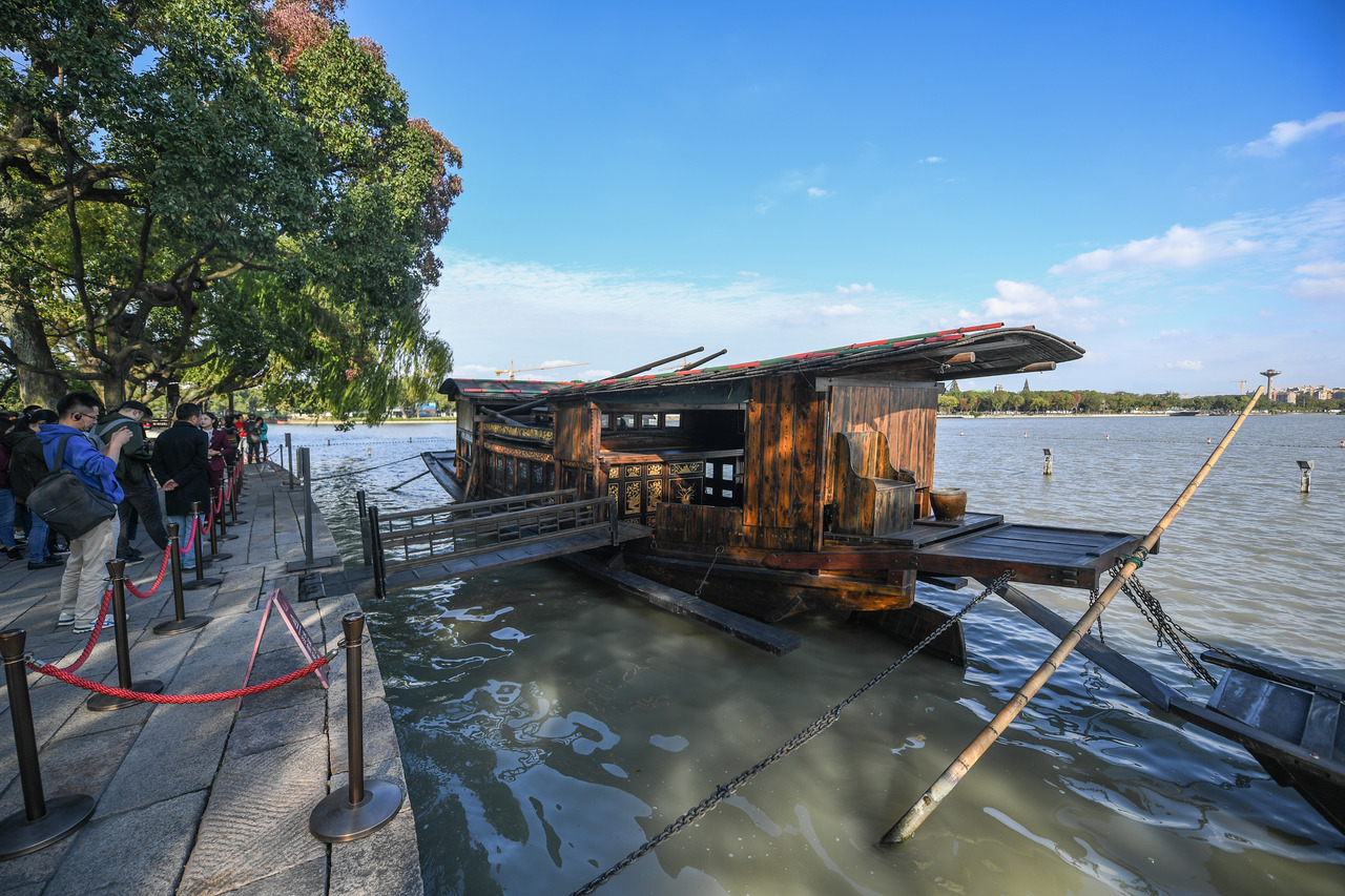 湖心島畔,紅船靜臥,船頭朝著太陽升起的方向,生動還原了中國共產(chǎn)黨誕生時的場景?!傲暯酵具M了船艙,他有感而發(fā),說南湖是他向往已久的地方,這次來浙江工作,第一次就來南湖參觀,是非常有意義的事?!睍r任南湖革命紀念館講解員黃曉琦回憶。