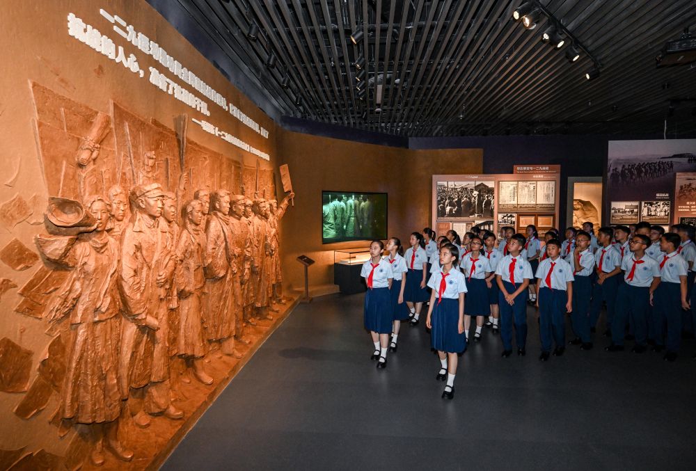 2025年7月7日上午,北京市第十二中學(xué)的少先隊員參觀紀(jì)念全民族抗戰(zhàn)爆發(fā)88周年儀式暨《為了民族解放與世界和平》主題展覽。新華社記者 陳曄華 攝
