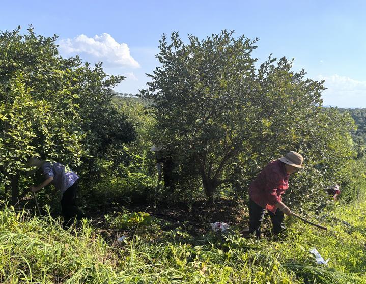村民在河南省光山縣槐店鄉(xiāng)司馬光油茶園內(nèi)勞作(2025年7月2日攝)。新華社記者 劉金輝 攝