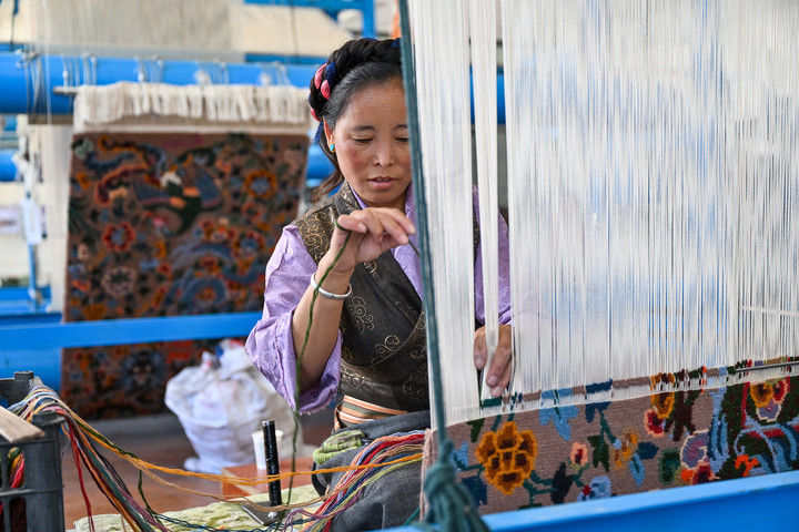 2025年7月18日,江孜藏毯文化發(fā)展有限責(zé)任公司的員工在生產(chǎn)車間內(nèi)編織藏毯。西藏日喀則市江孜縣是著名的藏毯(藏族稱為“卡墊”)之鄉(xiāng),織毯歷史悠久。藏族卡墊織造技藝于2006年被列入國(guó)家級(jí)非物質(zhì)文化遺產(chǎn)代表性項(xiàng)目名錄。近年來(lái),江孜藏毯在守護(hù)傳統(tǒng)技藝的同時(shí)積極創(chuàng)新,通過(guò)建立合作社、開(kāi)辦技能培訓(xùn)班等方式擴(kuò)大靈活就業(yè)規(guī)模,讓更多人在家門(mén)口織藏毯增收。