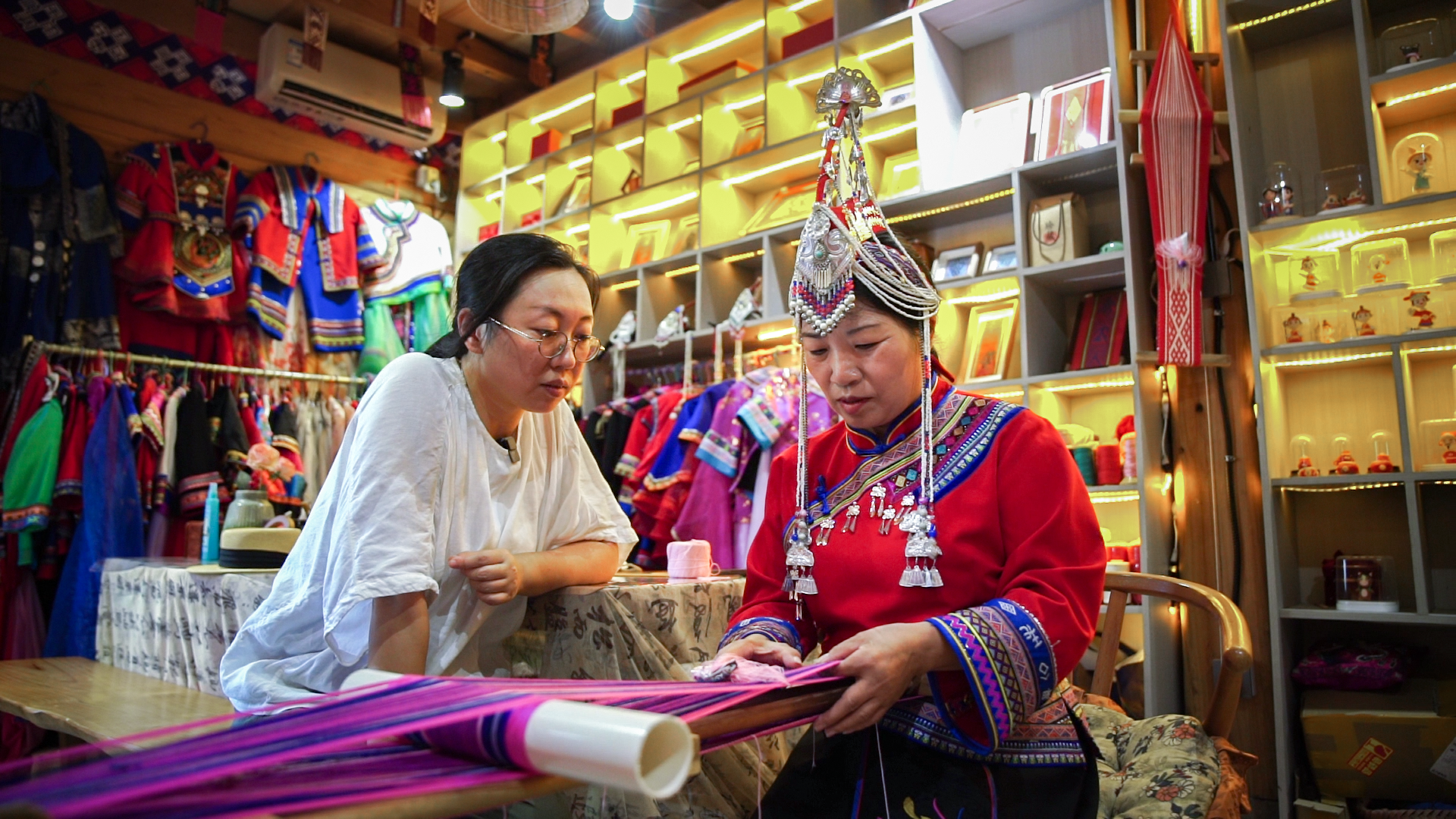 胡珊(左一)在庫村非遺工坊學做畬族彩帶(央廣網(wǎng)發(fā) 林港 攝)