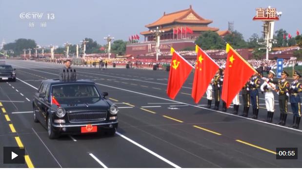 偉大旗幟光耀千秋。中國共產(chǎn)黨黨旗、中華人民共和國國旗、中國人民解放軍軍旗在受閱部隊最前方迎風(fēng)招展。檢閱車行進至黨旗、國旗、軍旗前,敬禮號角響起,習(xí)近平停車肅立,以注目禮向三面旗幟莊嚴致敬。
