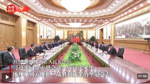 9月4日晚,中共中央總書記、國家主席習(xí)近平在北京人民大會(huì)堂同來華出席紀(jì)念中國人民抗日戰(zhàn)爭(zhēng)暨世界反法西斯戰(zhàn)爭(zhēng)勝利80周年活動(dòng)的朝鮮勞動(dòng)黨總書記、國務(wù)委員長金正恩舉行會(huì)談。