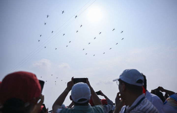 9月3日,習(xí)近平總書記同來自五大洲的外國友人并肩站立在天安門城樓上。26架直升機(jī)組成巨大的“80”字樣飛過,眾人仰首凝望。