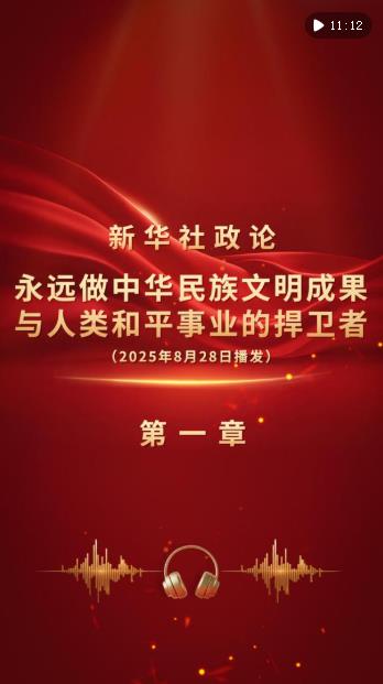 新華社8月28日播發(fā)《新華社政論|永遠(yuǎn)做中華民族文明成果與人類和平事業(yè)的捍衛(wèi)者——寫(xiě)在中國(guó)人民抗日戰(zhàn)爭(zhēng)暨世界反法西斯戰(zhàn)爭(zhēng)勝利80周年之際》。我們邀請(qǐng)誦讀嘉賓任志宏演播“第一章”。