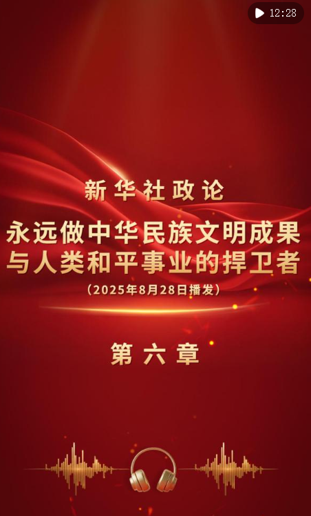 新華社8月28日播發(fā)《新華社政論|永遠(yuǎn)做中華民族文明成果與人類和平事業(yè)的捍衛(wèi)者——寫在中國人民抗日戰(zhàn)爭暨世界反法西斯戰(zhàn)爭勝利80周年之際》。我們邀請(qǐng)誦讀嘉賓劉勁演播“第六章”。