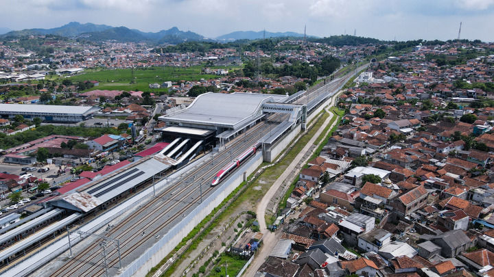 這是2025年5月20日在印度尼西亞帕達(dá)拉朗拍攝的雅萬高鐵列車(無人機(jī)照片)。新華社記者 徐欽 攝