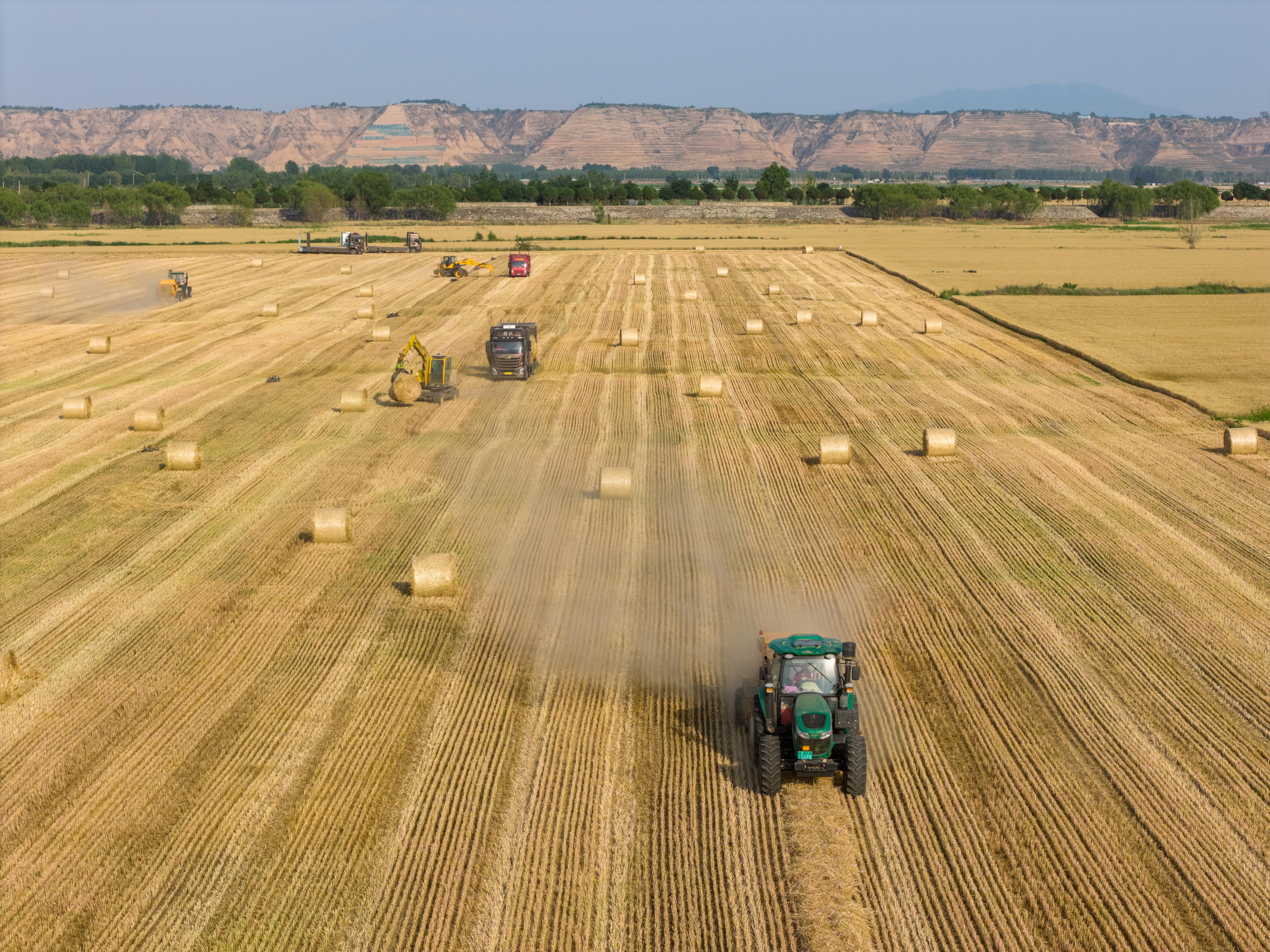 △據(jù)國(guó)家統(tǒng)計(jì)局發(fā)布的數(shù)據(jù),2025年全國(guó)夏糧總產(chǎn)量14973.8萬噸,實(shí)現(xiàn)穩(wěn)產(chǎn)豐收。圖為今年6月,山西運(yùn)城裴莊鎮(zhèn)黃河灘涂上,農(nóng)機(jī)手忙著實(shí)施小麥秸稈打捆和裝車運(yùn)輸作業(yè)。