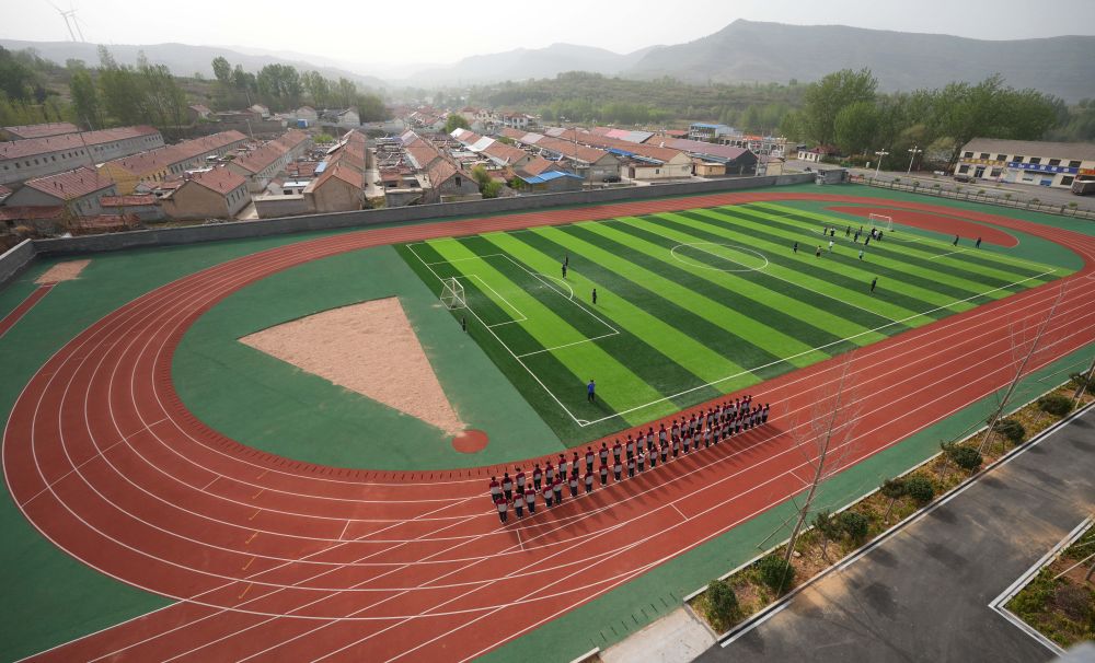 在位于山東濰坊市臨朐縣石家河村的臨朐縣彌水教育集團石家河校區(qū),學生在操場塑膠跑道上進行體育鍛煉(2025年4月17日攝)。新華社記者 徐速繪 攝