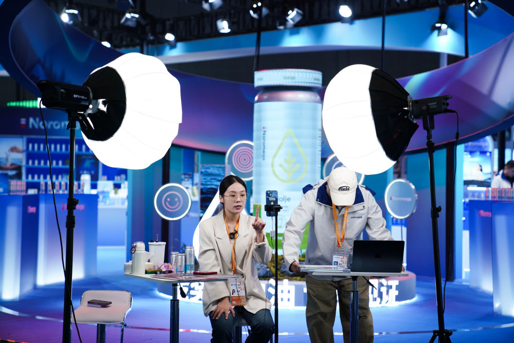 2025年11月4日,工作人員在第八屆進博會醫(yī)療器械及醫(yī)藥保健展區(qū)直播。本屆進博會直播密度大、形式多樣,有的展位專門搭建直播區(qū)域,燈光、背景、展板一應俱全;有的展位手機一架、產品一擺,直播就地開始;還有的直播間是“流動的”,達人主播們拿著手機、別著麥克風,穿梭于各個品牌展位間現場推薦……八年來,進博會影響力逐年遞增,越來越多的中國消費者愿意通過直播了解進博會上的“全球好物”。