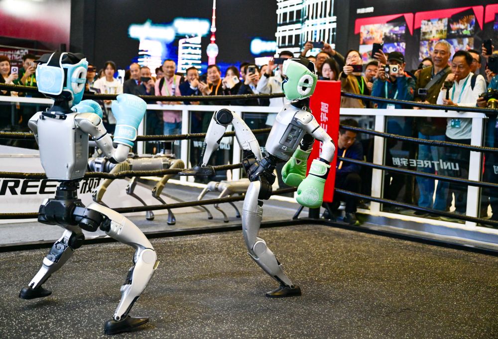 2025年11月6日,人形機器人在第八屆進博會宇樹科技展臺進行格斗表演。當日,在技術裝備展區(qū)宇樹科技展臺,兩臺G1人形機器人的格斗表演吸引了眾多觀眾。它們戴著護具及拳套,施展直拳、勾拳、左右鞭腿,展示倒地自主起身等復雜動作,不時贏得觀眾喝彩。