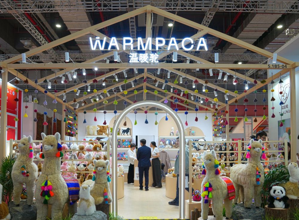 2025年11月5日在第八屆進博會消費品展區(qū)拍攝的“溫暖駝”展臺。從秘魯阿雷基帕的小店,到進博會的展臺,再到全球消費者手中,進博會為“溫暖駝”帶來了巨大的發(fā)展機遇。本屆進博會,“溫暖駝”展位面積已從2018年首屆進博會的9平方米拓展至54平方米,并在上海、廈門等地開設6家門店。源自進博會的“溫暖駝”訂單不僅助力秘魯200多個家庭脫貧,還倒逼一場“品質革命”,讓羊駝玩偶制作對標世界標準。