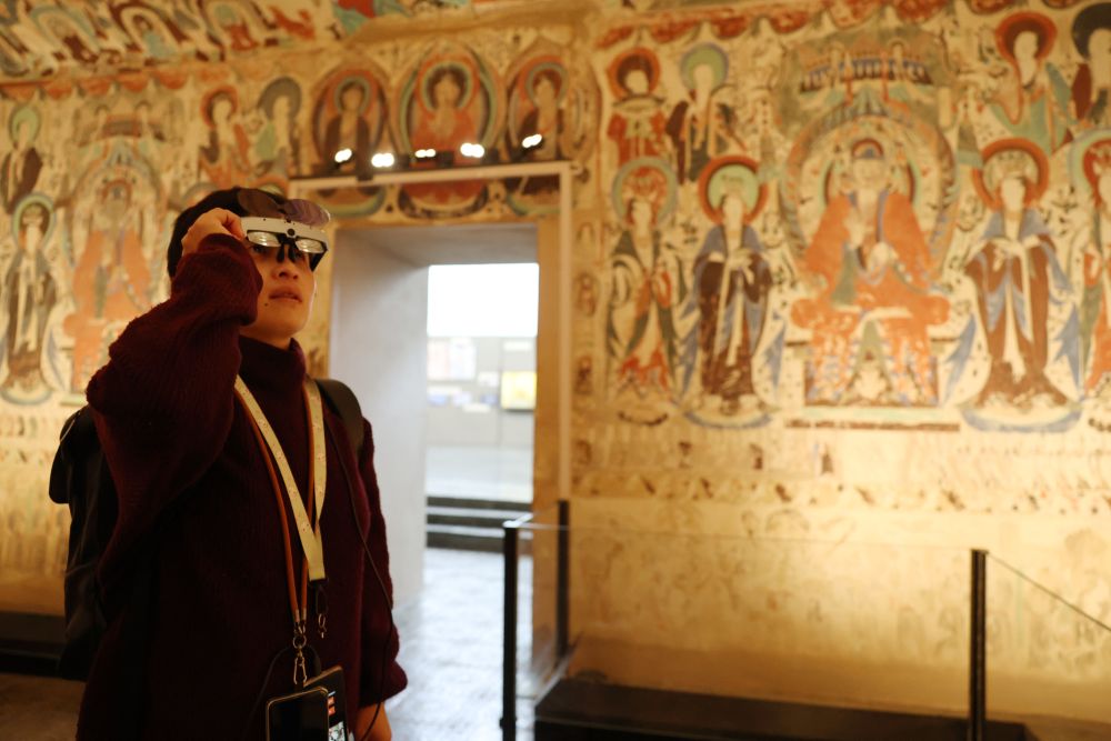 2025年10月30日,在敦煌石窟文物保護(hù)研究陳列中心,游客使用AR設(shè)備在復(fù)制洞窟參觀體驗。