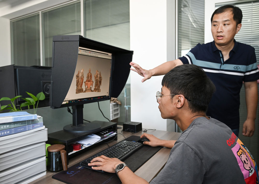2023年8月3日,敦煌研究院文物數(shù)字化研究所的工作人員在展示莫高窟彩塑三維重建的成果。近年來,敦煌研究院持續(xù)加大文物保護(hù)基礎(chǔ)研究和應(yīng)用研究,不斷加強(qiáng)文物科技保護(hù)力度,提升科研平臺建設(shè),為文物保護(hù)和文化遺產(chǎn)事業(yè)發(fā)展奠定良好基礎(chǔ)。