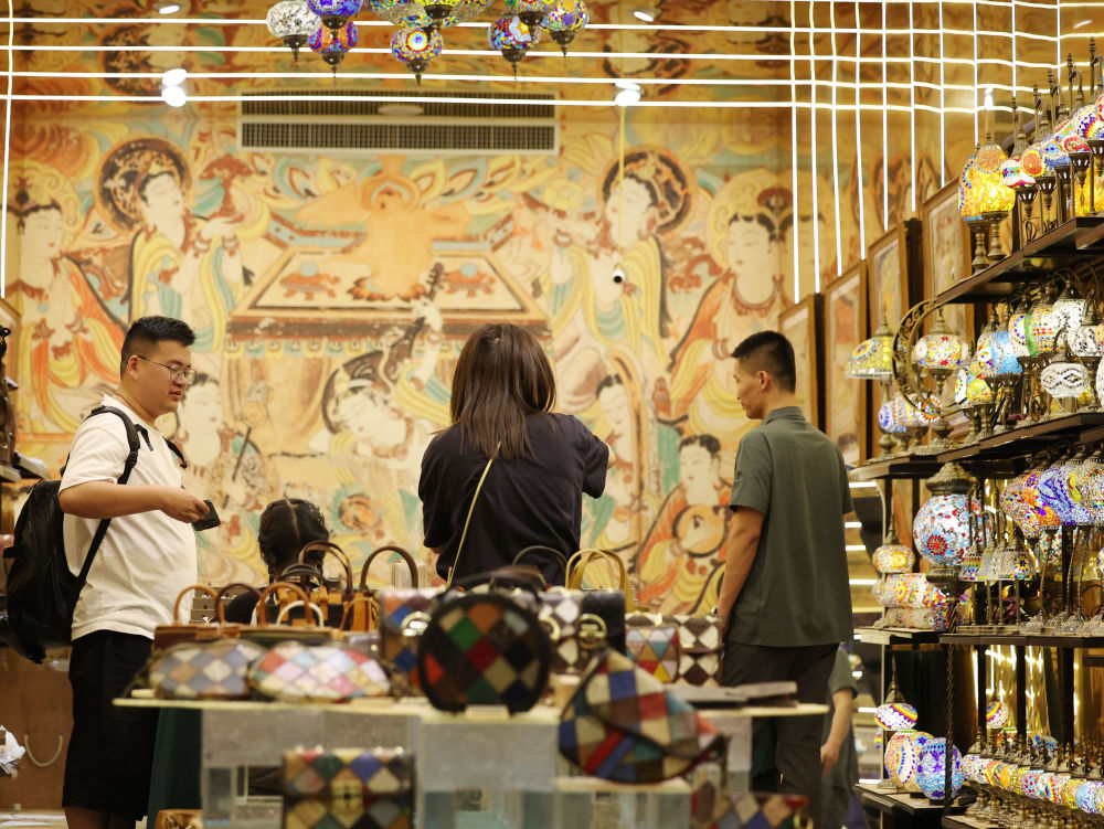 2025年6月26日,游客在敦煌夜市選購文創(chuàng)產(chǎn)品。今年以來,敦煌市全面改造敦煌夜市等特色街區(qū),圍繞敦煌深厚的歷史文化底蘊,融入壁畫、絲路文化等元素,通過布設(shè)文化景觀小品、打造沉浸式餐飲體驗空間、上線特色文創(chuàng)產(chǎn)品等方式,給游客帶來多元體驗,“夜經(jīng)濟(jì)”持續(xù)升溫,不斷釋放文旅消費潛力。