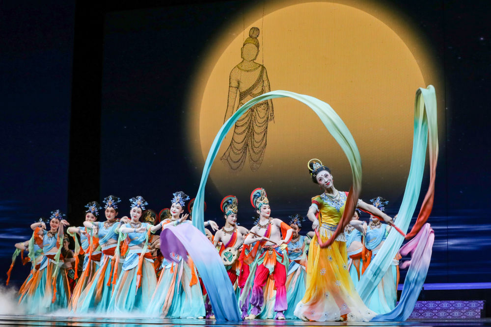 2025年9月22日,在敦煌舉辦的“相約敦煌”國際文化交流演出活動上,甘肅省演藝集團(tuán)的演員展演《樂動敦煌》選段?!稑穭佣鼗汀方柚鷮δ呖弑诋?、藏經(jīng)洞古籍的解讀梳理,活化敦煌古樂器、古樂譜研發(fā)成果,通過全息投影等手段,結(jié)合專業(yè)演員的表演,將莫高窟壁畫中的樂舞盛景生動再現(xiàn),讓觀眾沉浸式感悟傳承千年的敦煌樂舞文化魅力。