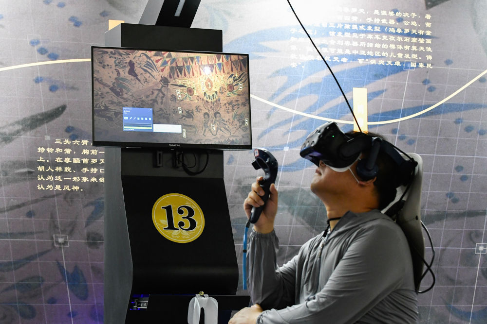 2024年7月22日,一名游客在敦煌莫高窟“尋境敦煌——數(shù)字敦煌沉浸展”上借助VR設(shè)備沉浸式游覽莫高窟第285窟虛擬場景?!皩ぞ扯鼗汀本C合運用了VR虛擬現(xiàn)實、三維建模、游戲引擎的物理渲染和全局動態(tài)光照等新技術(shù),高精度立體還原了莫高窟第285窟。游客戴上VR眼鏡,不僅可以零距離觀賞壁畫、360度自由探索洞窟細(xì)節(jié),還能“飛升”到窟頂,身臨其境參與壁畫故事情節(jié),沉浸式感受敦煌文化的魅力。