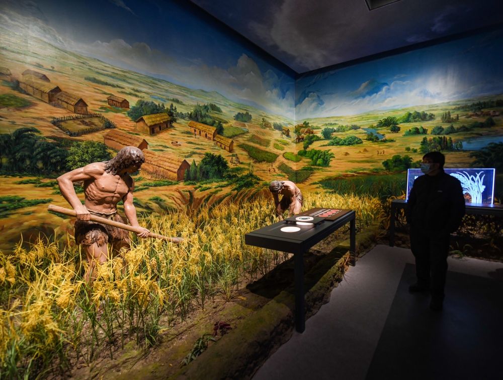 2022年1月21日,觀眾在成都市寶墩遺址展館參觀“寶墩遺址與寶墩文化展”。該展覽講述了寶墩文化時期,古蜀先民深入成都平原扎根繁衍、筑城而居、種植稻米等歷史。